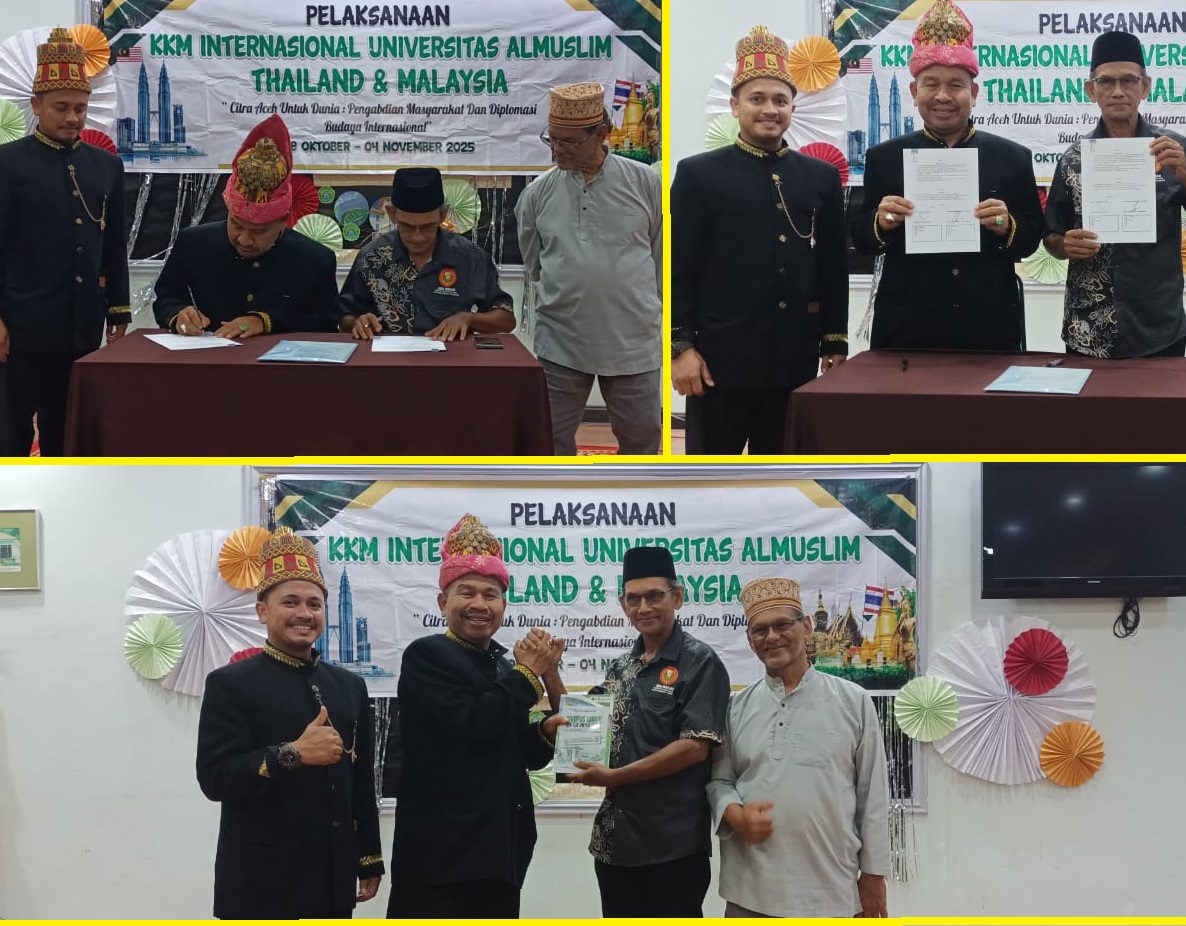 Dalam lawatan kerjanya ke Kedah Malaysia dalam rangka pembukaan dan penyerahan mahasiswa Universitas Almuslim Bireuen Aceh, yang melaksanakan KKM Tematik Internasional 2025 di Kampung Aceh Management Centre (KAMC), daerah Yan – Kedah Malaysia, Rektor Universitas Almuslim melakukan ramah tamah dengan masyarakat disana, dan mengikat Kerjasama (Jum’at Malam, 31-10-2025).