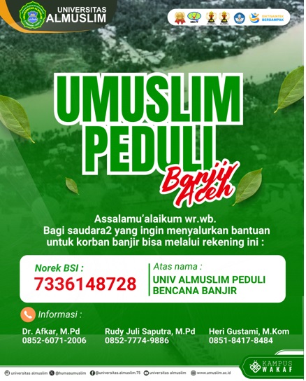Sebagaimana di rilis beberapa media, selama sepekan ini, Universitas Almuslim Bireuen, dalam membantu dampak Bencana Hidrometeorologi (Banjir Bandang) di Kabupaten Bireuen, secara khusus kecamatan yang masuk wilayah Peusangan Raya.