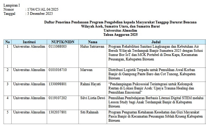 Dr Afkar, menyebut dalam lampiran pengumumam yang disampaikan tersebut, usulan Umuslim disetujui semua dengan 5 proposal dengan nilai kontrak hampir 2 miliar. Diantaranya, proposal Dr Marwan dkk, bertema “Distribusi Logistik Terpadu untuk Pemulihan Awal Korban Banjir di Gampong Pante Baro dan Cot Tunong, Kabupaten Bireuen.