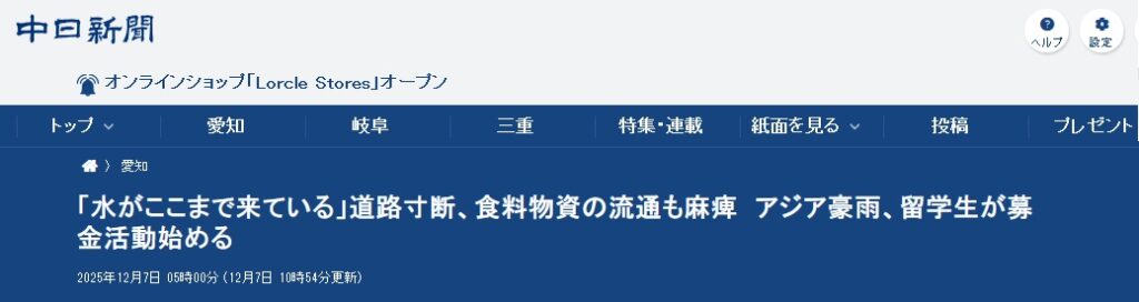 Berita pada media yang bertajuk “Air telah datang sejauh ini” Gangguan jalan, distribusi pasokan makanan juga lumpuh hujan lebat Asia, siswa internasional mulai kegiatan penggalangan dana” terbit pada 7 Desember 2025 pukul 05: 00, sebut Rektor. memberitakan bahwa hujan deras yang melanda Asia Tenggara dan Asia Selatan, termasuk Indonesia, Thailand, dan Sri Lanka, pada akhir November menyebabkan banjir dan tanah longsor, menewaskan lebih dari 1.500 orang, dan pencarian banyak orang hilang masih terus berlanjut.